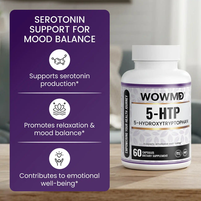 WOWMD 5-HTP contains 5-Hydroxytryptophan ( 5-HTP), a natural precursor to serotonin. Supplementing with 5-HTP helps increase serotonin levels in the brain, contributing to improved mood regulation, emotional well-being, and overall mental clarity. [1]
