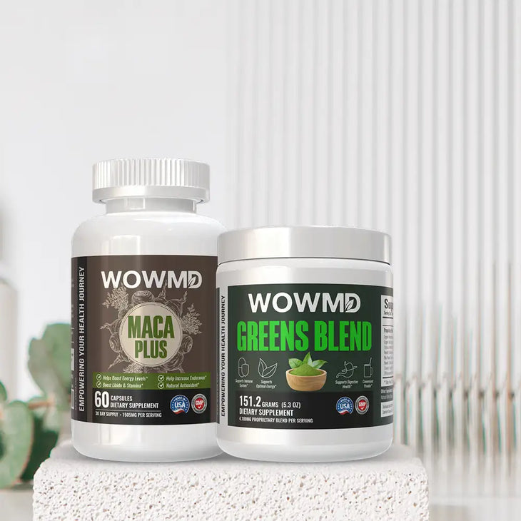 The WOWMD Energy Booster Combo offers Sustained energy and overall wellness. Harnessing Maca Plus for vitality & hormone balance, and Greens Blend nutrient-rich superfood synergy, this bundle keeps you energized & fresh.