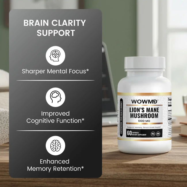 Boosts Mental Clarity & Focus Regular use of WOWMD Lion's Mane Mushroom can help sharpen focus, enhance mental clarity, and improve overall productivity.