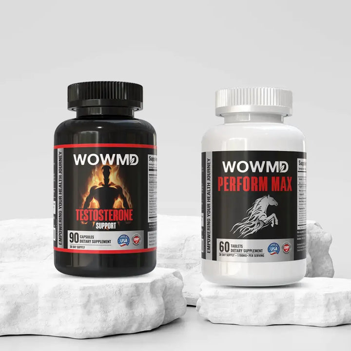 The Peak Performance Duo offers a comprehensive approach to male health and vitality. WOWMD Testosterone Support is formulated with ingredients like magnesium, zinc, and Tribulus to enhance testosterone production and overall well-being and WOWMD Perform Max is designed to optimize physical performance, improve stamina, and increase muscle strength with potent ingredients like Epimedium Extract, Maca Powder, and L-Arginine. Together, these products provide an all-in-one solution for peak performance, stamina, and health.