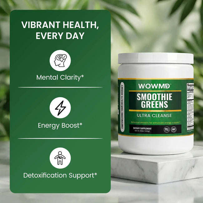 WOWMD Ultra Cleanse Smoothie Greens helps cleanse and energize your body. Many people notice a boost in energy and improved digestion after just one month. Continued use can help with detoxification, enhanced mental clarity, and a more vibrant, energized feeling.